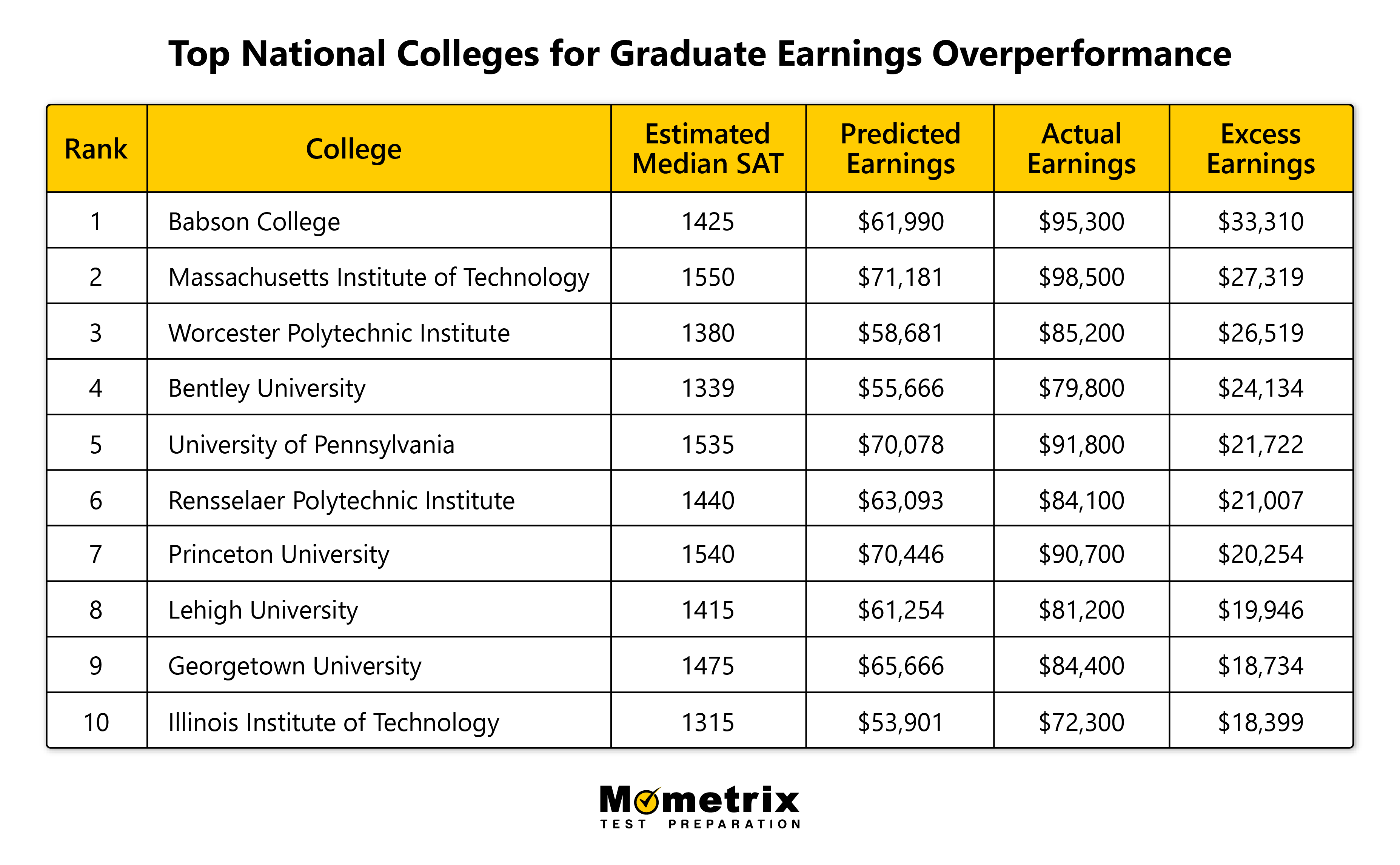 We can answer this question by comparing our model’s prediction of earnings by median college SAT to the actual median earnings of students. We did just that, crunched the numbers. Here are the top ten colleges that most exceed our statistical model, and by how much: