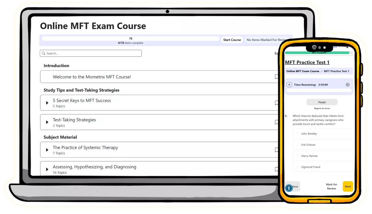 - Practice with 3 full-length MFT practice tests that mimic the actual questions you’ll find on the exam