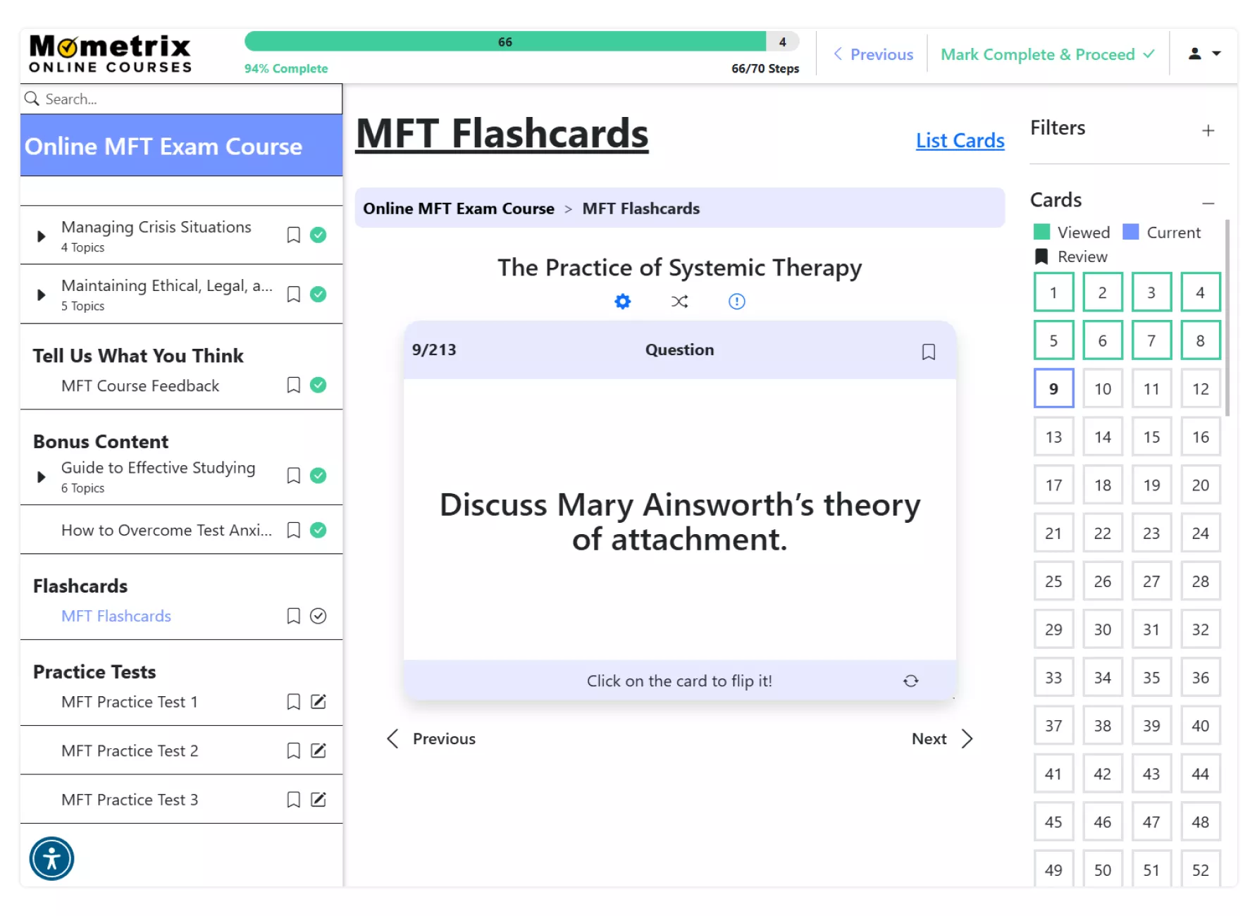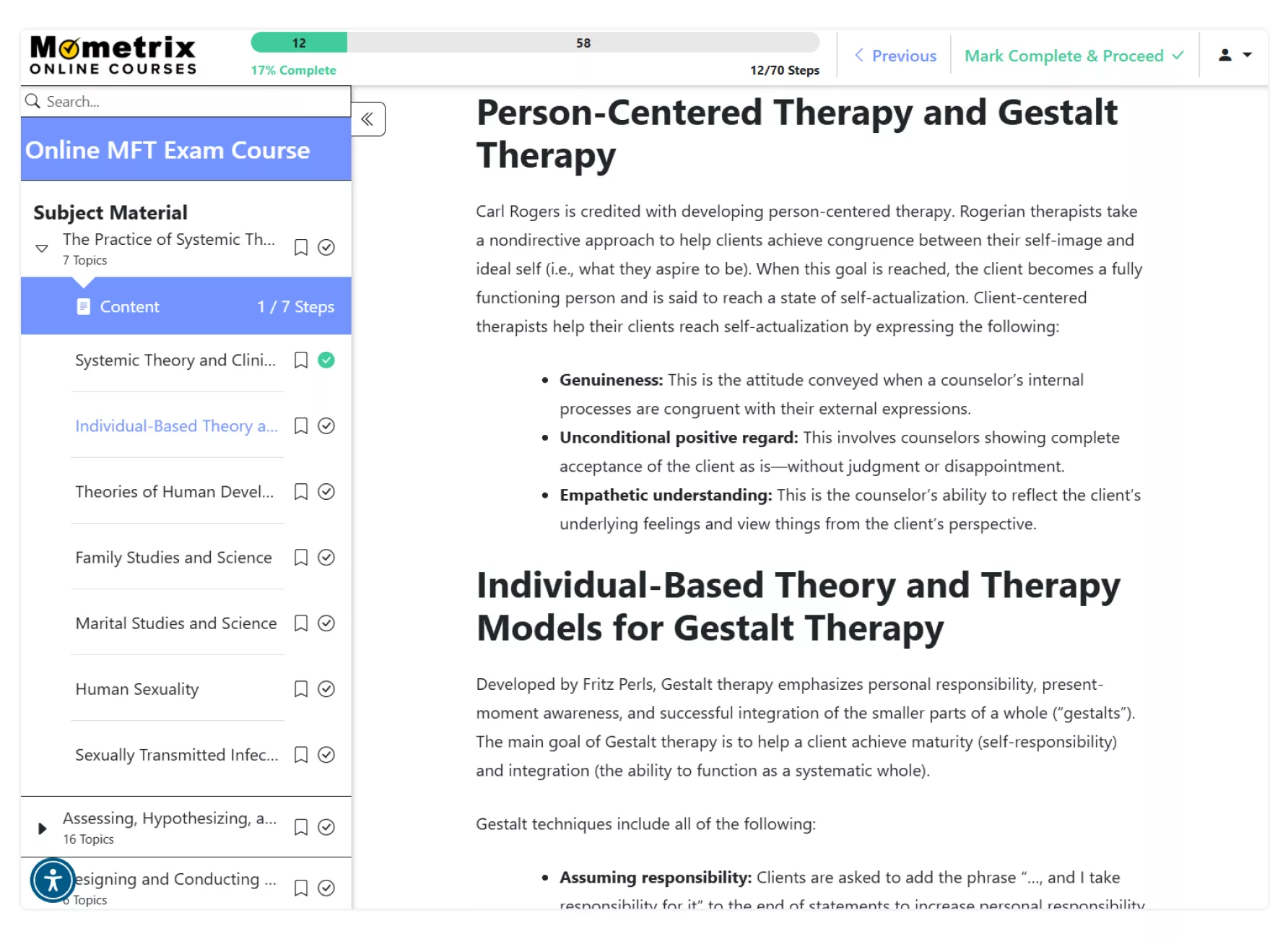 Our course includes the secret keys to the MFT exam that we’ve learned through years of research. We’ll tell you how to get questions right when you have no idea what the answer is, the clues hidden in questions to help you guess correctly, and the best way to maximize your studying while minimizing your effort.
