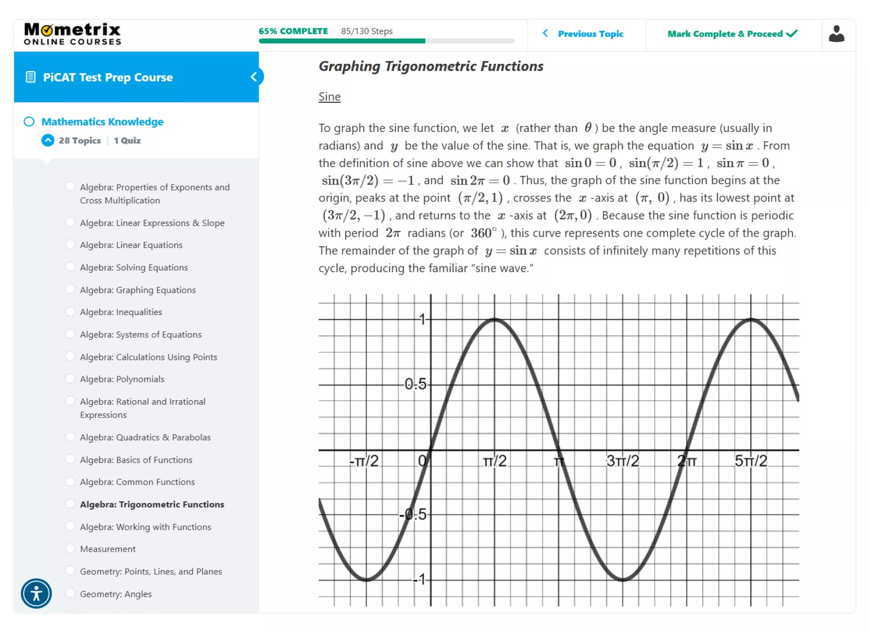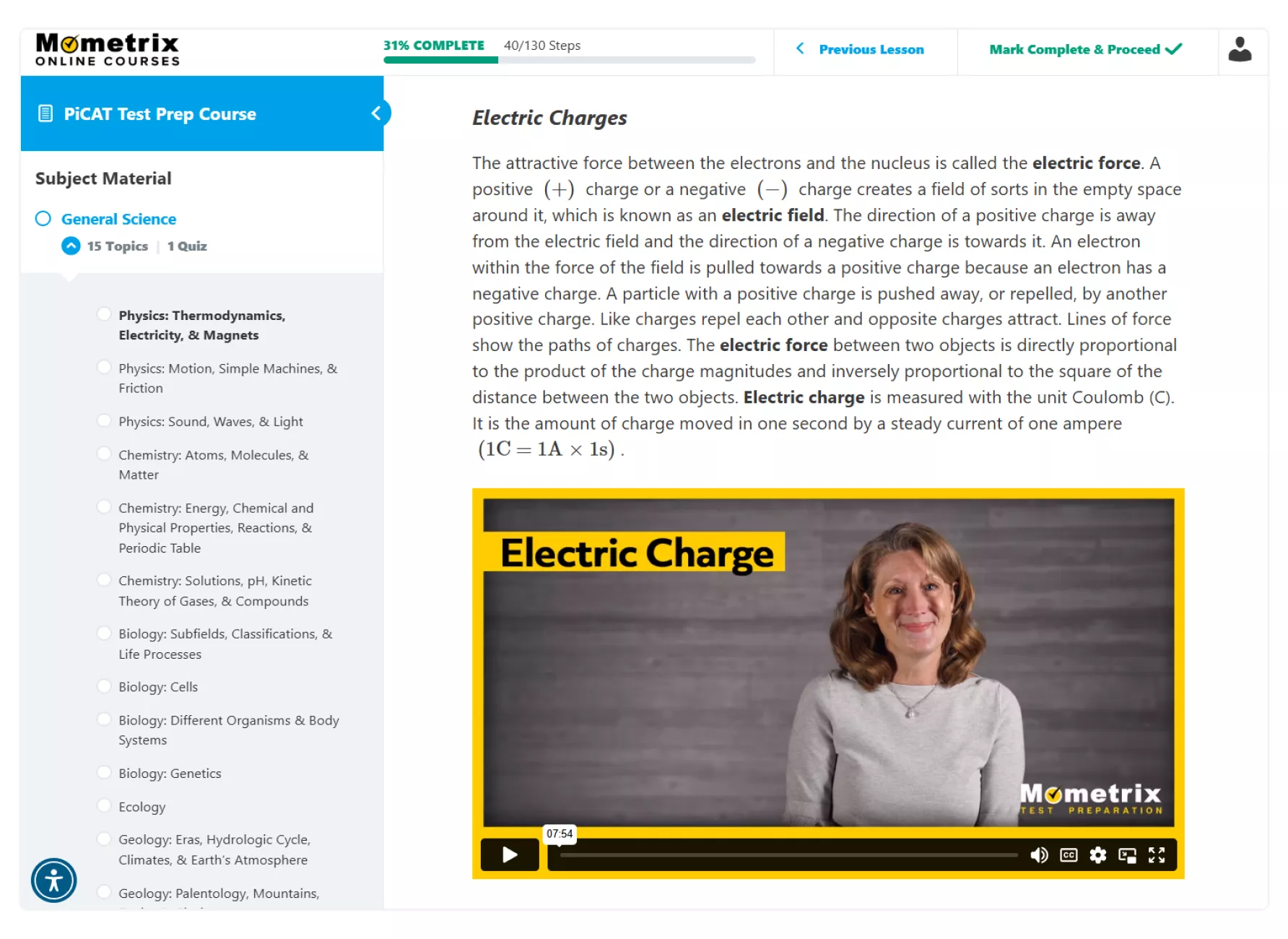 - Track your progress by marking lessons complete and reviewing your practice question statistics